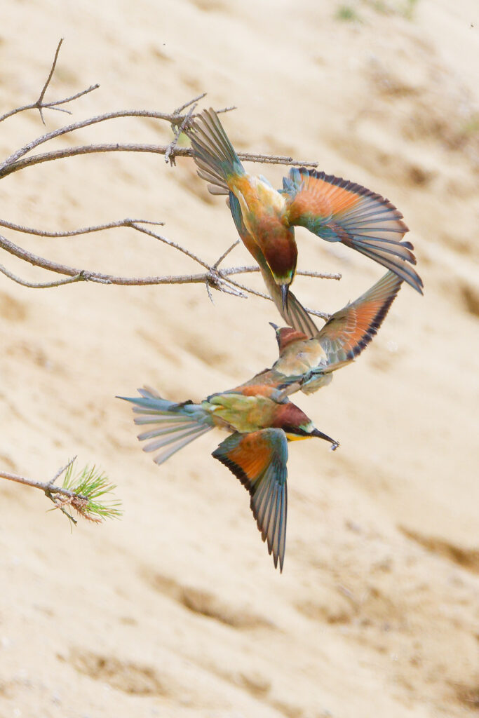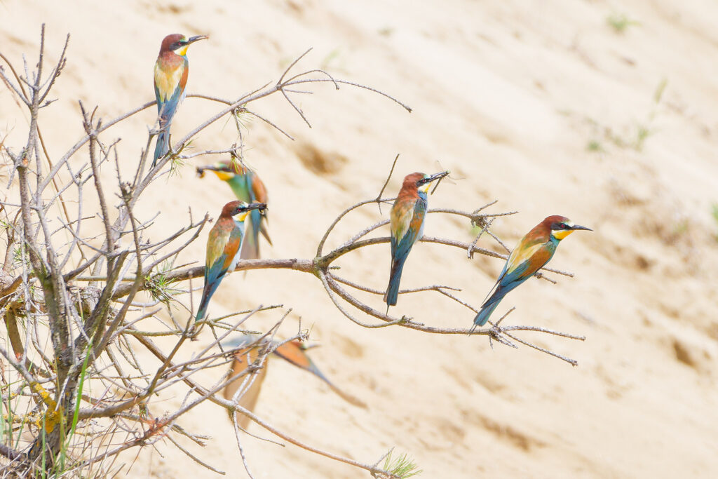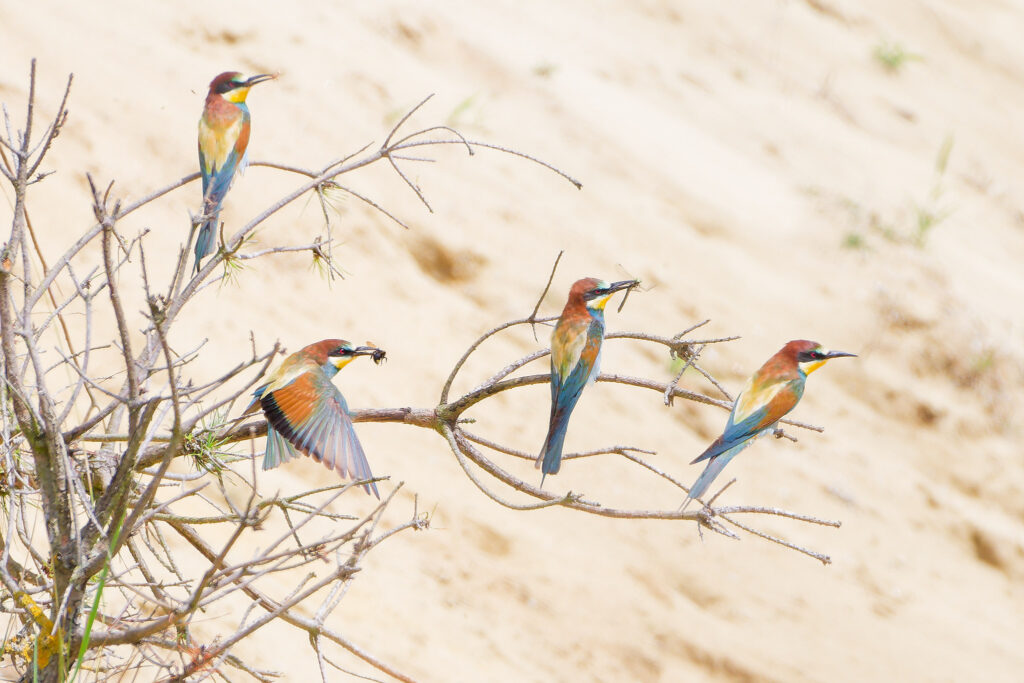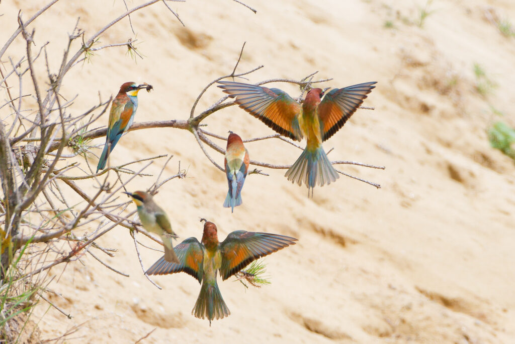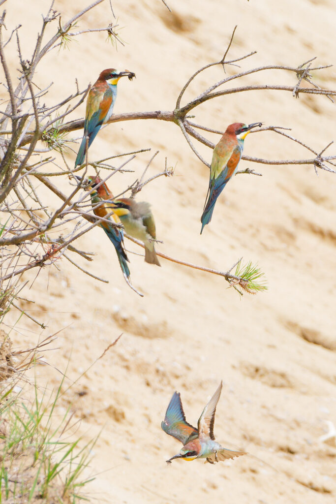 Wow, was war das für ein Treiben als Erich und ich im letzten Jahr eine Bienenfresser Kolonie besuchten! Während einige Elterntiere geduldig darauf warteten, dass die Jungen aus ihrem Bau kamen, flogen Andere mit ihrer Beute direkt in die Höhlen um ihren Nachwuchs zu füttern. Dazwischen gesellten sich dann einige bereits ausgeflogene Jungtiere, die darauf warteten gefüttert zu werden