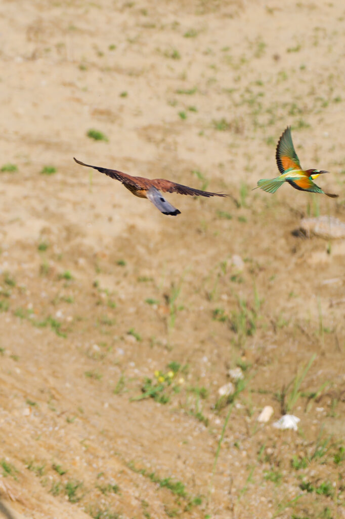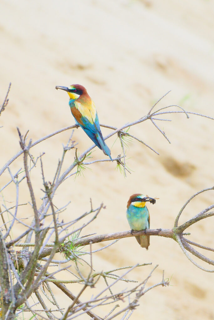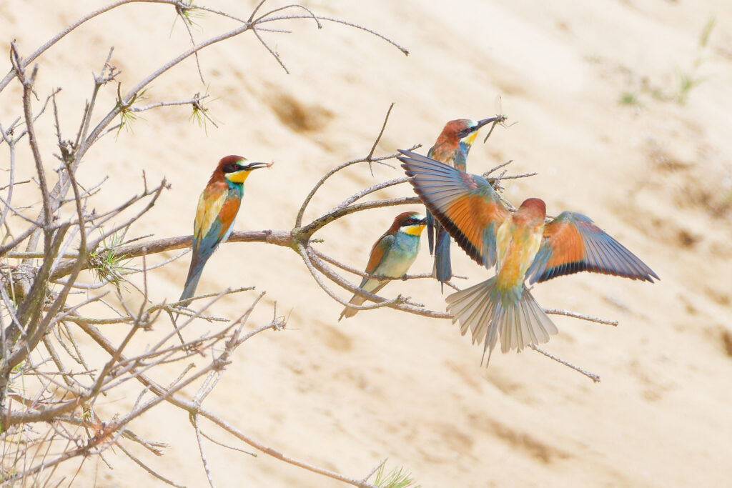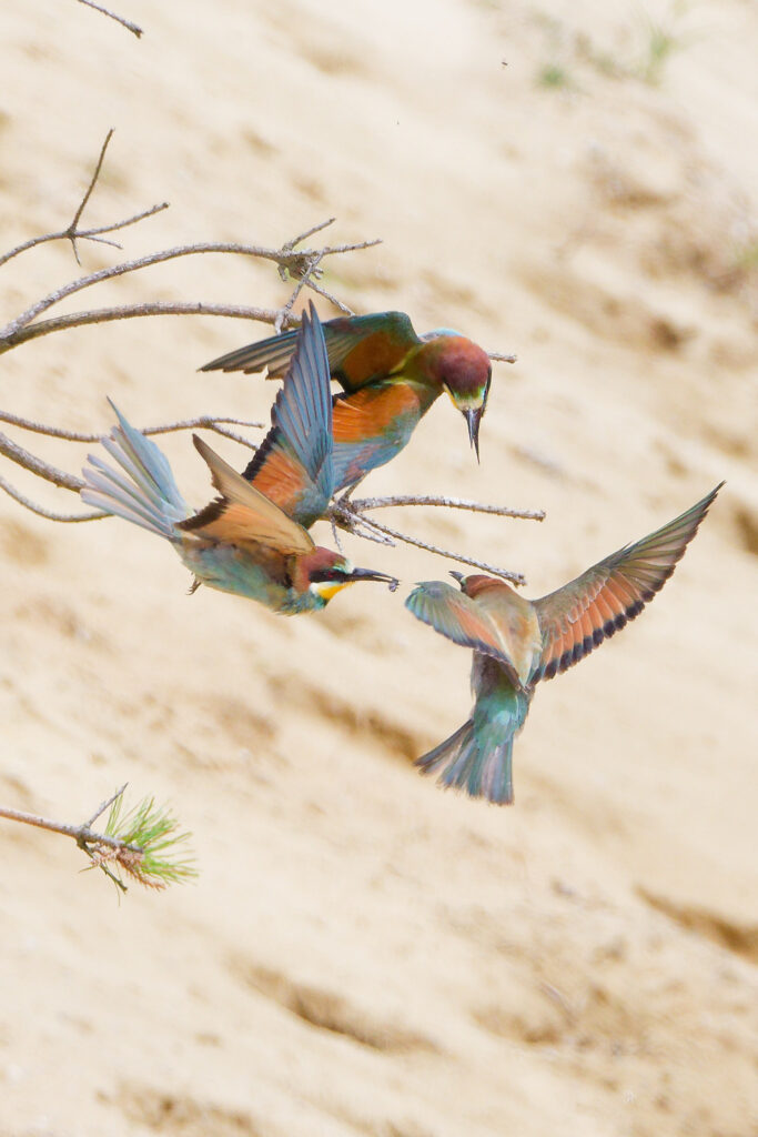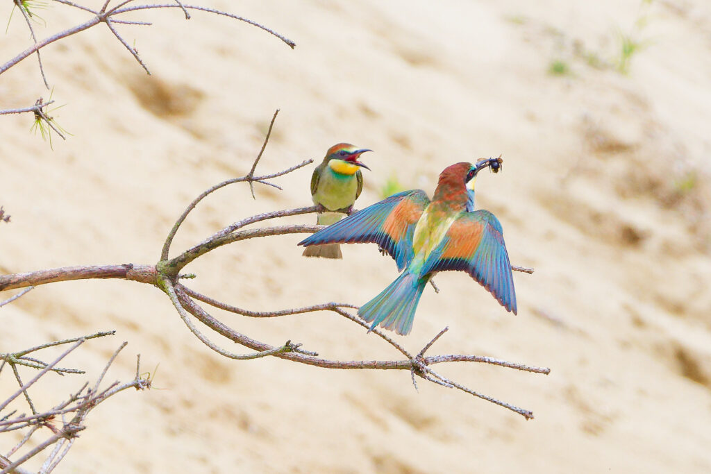 Wow, was war das für ein Treiben als Erich und ich im letzten Jahr eine Bienenfresser Kolonie besuchten! Während einige Elterntiere geduldig darauf warteten, dass die Jungen aus ihrem Bau kamen, flogen Andere mit ihrer Beute direkt in die Höhlen um ihren Nachwuchs zu füttern. Dazwischen gesellten sich dann einige bereits ausgeflogene Jungtiere, die darauf warteten gefüttert zu werden